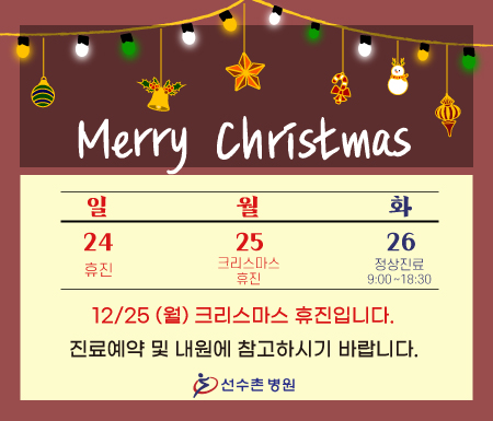 2023년 크리스마스 휴진 안내 페이지 정보 작성자 선수촌병원 작성일23-12-15 12:35 조회13,181회 댓글0건 이전글 다음글 목록 본문 안녕하세요. 선수촌병원입니다. 12월 25일 (월) 크리스마스 휴진입니다. 진료예약 및 내원에 참고하시기 바랍니다. 감사합니다. 댓글목록 등록된 댓글이 없습니다. 이전글 다음글 목록