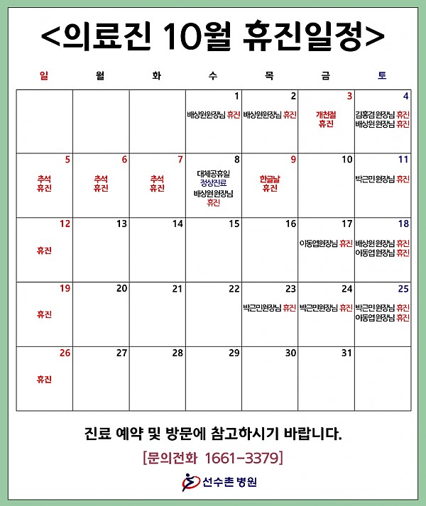 배상원 원장님 : 10/1~4(수~토), 10/8(수), 10/18(토) 휴진