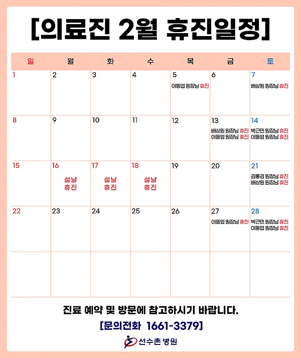이동엽 원장님 : 2/5(목), 2/13-14(금-토), 2/27-28(금-토) 휴진